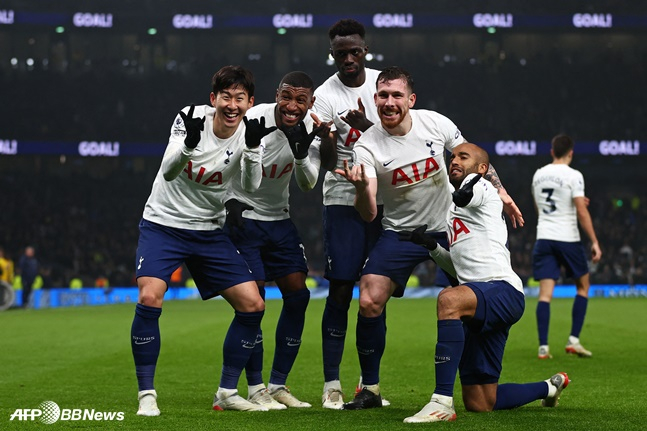 지난 27일 크리스탈 팰리스전에서 골을 터뜨린 토트넘 손흥민(왼쪽)이 동료들과 함께 스파이더맨 세리머니를 하…