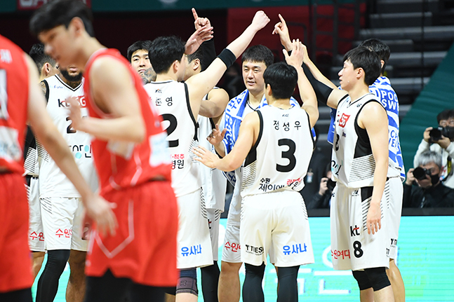 프로농구 수원 KT 선수들이 28일 고양 오리온전 승리 직후 단체 세리머니를 펼치고 있다. /사진=KBL 프…