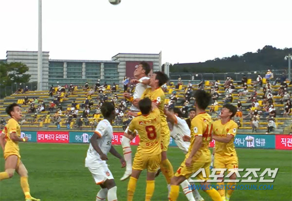 18일 광주-제주의 경기 도중 제주 김오규의 팔꿈치에 광주 이한도가 부딪히는 장면. 중계화면 캡쳐 [스포츠조…