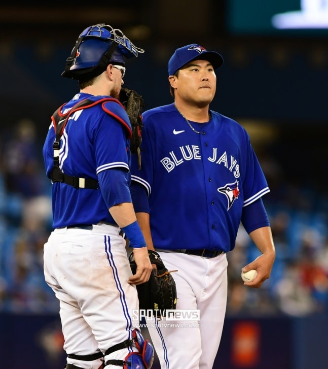 ▲ 토론토 블루제이스 류현진(오른쪽)이 조기 강판되며 아쉬워하고 있다. ⓒ 토론토(캐나다 온타리오주), 조미…