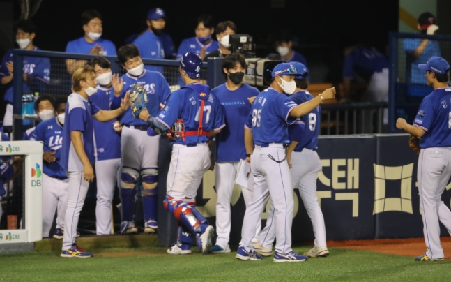삼성 선수들이 25일 잠실 LG전 무승부 후 더그아웃으로 들어가는 모습이다. /사진=삼성 라이온즈 결과는 같…