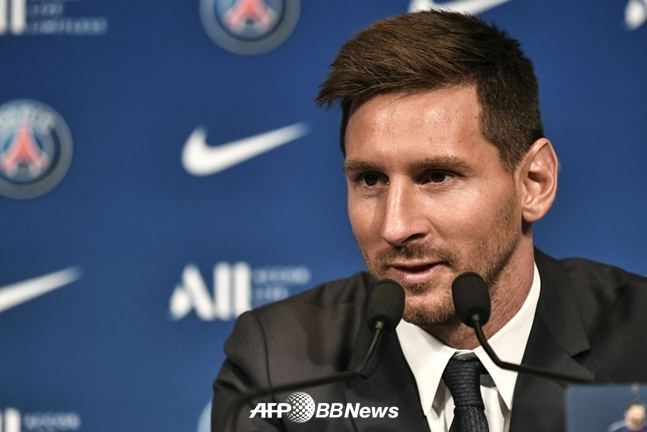 PSG 입단 기자회견을 하는 리오넬 메시./AFPBBNews=뉴스1 파리 생제르맹(PSG)가 마침내 리오넬 …