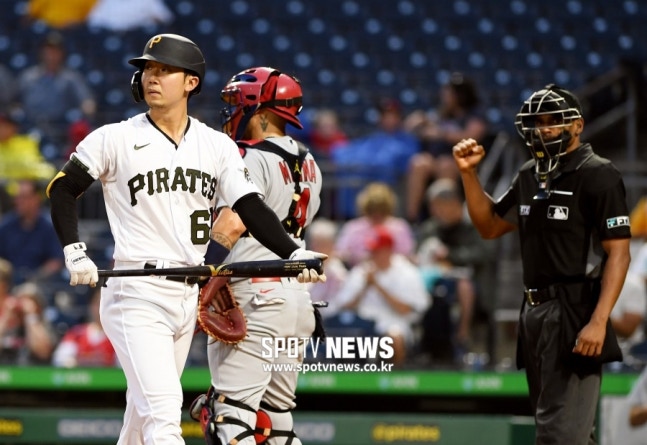 ▲ 피츠버그 박효준(왼쪽)이 12일 PNC파크에서 열린 세인트루이스와 홈경기에서 4회말 삼진을 당한 뒤 아쉬…