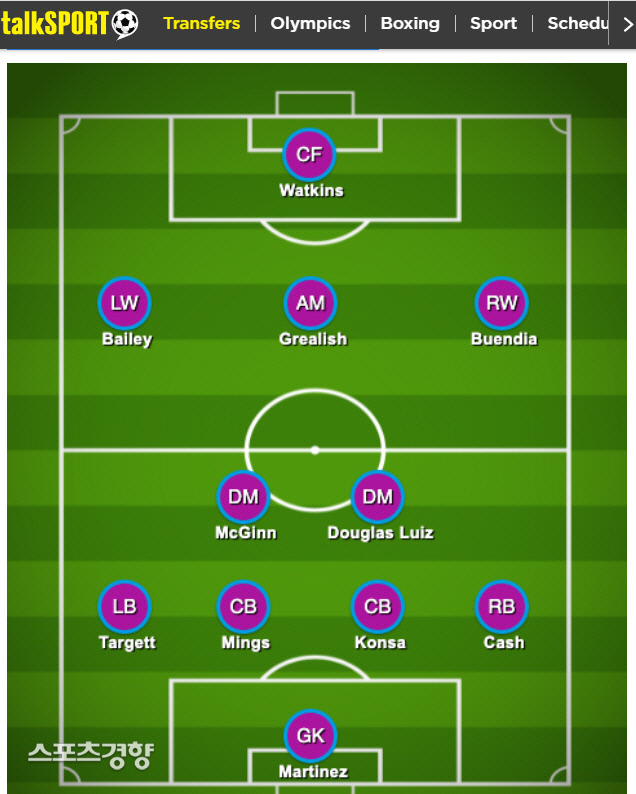 [스포츠경향] 아스톤 빌라의 두 번째 예상 라인업. ‘토크 스포츠’ 캡처 아스톤 빌라(…