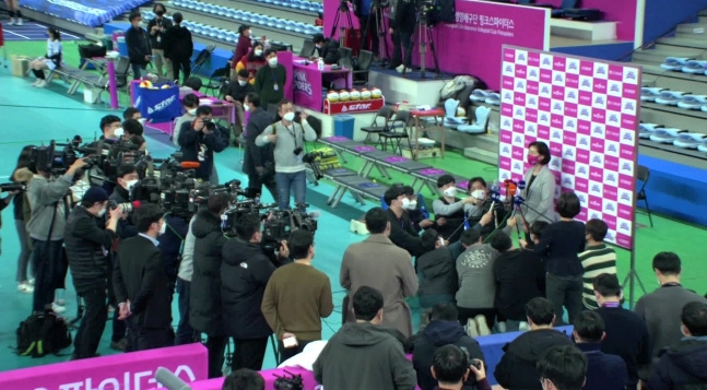 학교 폭력 전력으로 이재영-이다영에 대한 배구협회의 징계 결정 다음날 경기 전 인터뷰에 나선 박미희 감독. …