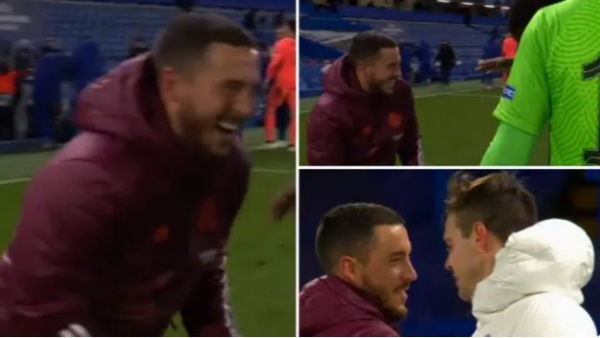 [스포탈코리아] 곽힘찬 기자= 에당 아자르(레알 마드리드)가 경기가 끝난 뒤 첼시 선수들과 대화를 나누며 웃…