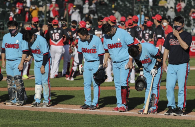 지난 5일 부산 사직구장에서 KIA에 5-8로 패한 롯데 선수들이 팬들에게 인사하고 있다. 연합뉴스 올시즌 …