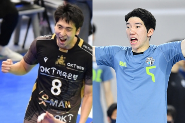 OK금융그룹 차지환(왼쪽)과 현대캐피탈 허수봉. (C)KOVO [스포츠타임스=홍성욱 기자] 월요일에도 남자배…