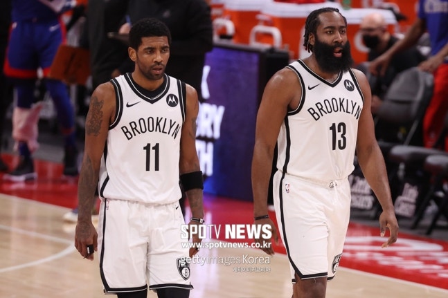 ▲ 브루클린 네츠의 카이리 어빙과 제임스 하든(왼쪽). 이 2명이 아무리 득점해도 이길 수 없었다. [스포티…