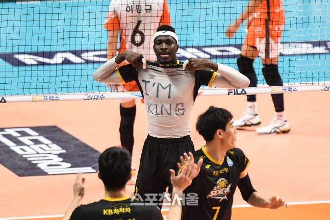 KB손해보험 케이타가 지난달 30일 OK금융그룹전에서 득점 후 세리머니를 하고 있다. 제공 | 한국배구연맹 …