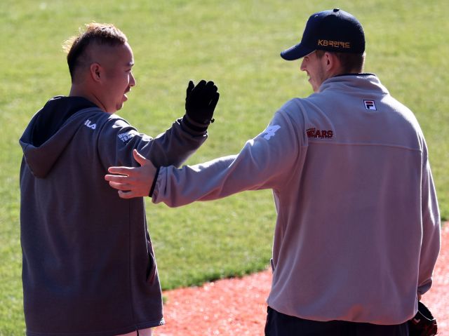 두산 베어스 투수 크리스 플렉센(오른쪽)이 지난해 11월 8일 서울 송파구 잠실구장에서 2020시즌 프로야구…
