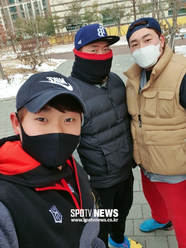 ▲ 최근 인천에서 함께 훈련 중인 kt 외야수 김도현과 이상원 트레이닝 코치, 탬파베이 내야수 최지만(왼쪽부…