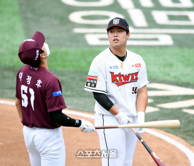 KT 강백호가 경기 전 상대 이정후와 만나 이야기를 나누고 있다. 최승섭기자 [스포츠서울 장강훈기자] KBO…
