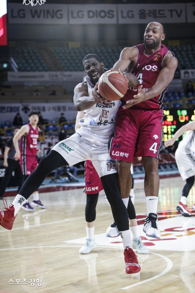 전자랜드의 헨리 심스(왼쪽)가 지난 9일 창원실내체육관에서 열린 프로농구 LG와의 경기에서 상대 외국인선수 …