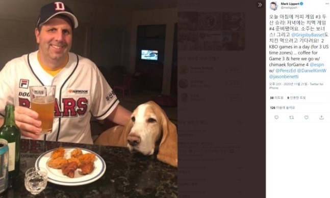 두산 베어스 응원하는 마크 리퍼트 전 주한미국대사 마크 리퍼트 전 주한미국대사가 21일(한국시간) 자신의 소…