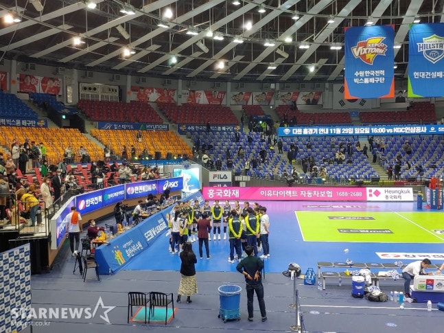 [스타뉴스 수원=한동훈 기자] 현대건설 이도희 감독과 선수단이 17일 수원 IBK기업은행전 패배 후 간단한 …