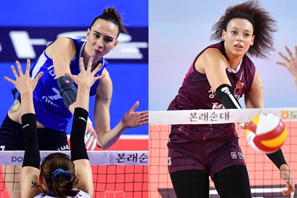 IBK기업은행 라자레바(왼쪽)와 KGC인삼공사 디우프. (C)KOVO [스포츠타임스=홍성욱 기자] IBK기업…