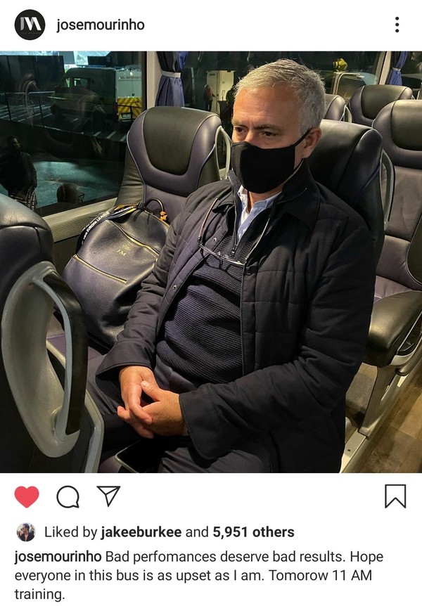 '관종' 무리뉴? 경기 끝나자마자 SNS, "내일 훈련은 오전 11시다"