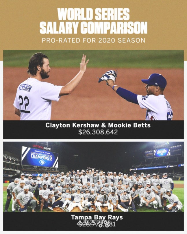[스포츠경향] ESPN이 20일 월드시리즈에서 맞붙는 다저스와 탬파베이의 몸값을 비교했다. 다저스 커쇼와 베…