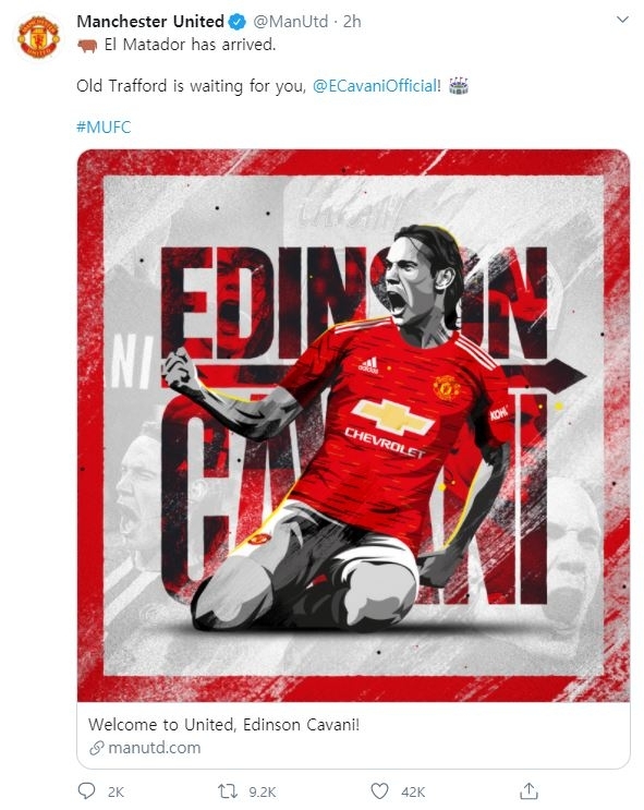맨체스터 유나이티드 유니폼을 입은 에딘손 카바니 [맨유 구단 트위터 캡처] 에딘손 카바니(33)이 잉글랜드 …