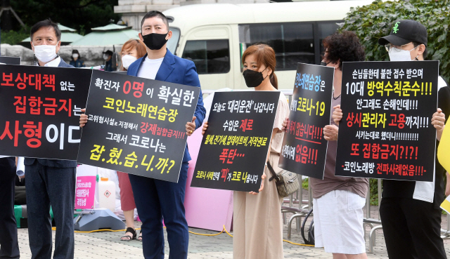 코인노래방 업주들이 9일 서울 여의도 국회 앞에서 생존권을 위한 기자회견을 하고 있다. 한국코인노래연습장협회…